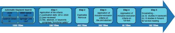 The term “functional safety” is searched within keywords, title, and abstract AND the following terms: