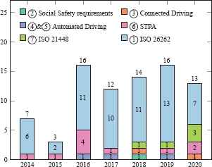 Some secondary studies from the last decade discuss safety and are specific to the automotive domain. A few studies ([53,54]) outline safety-related methods across the entire product life cycle, while others focus on a specific stage of product development [55], a specific technology [56] or a specific use-case [57]. In addition to the secondary studies, there is a proliferation of experience reports [58,59]. We do not cover experience reports in our related work since they form a different class of studies than secondary studies.