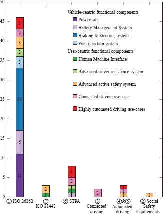 Studies by Kannan et al. and Gosavi et al. consider the entire product life cycle [53,54]. Kannan et al. [53] present a gap analysis between the objectives of the ISO 26262 standard and safety-related techniques to achieve these objectives. They conclude that there is a need for tooling for conducting HARA, combining subphases of product development, integration among the product development phases of design, requirement management, and validation and verification. They also find a lack of methods for ASIL decomposition for large-scale systems.