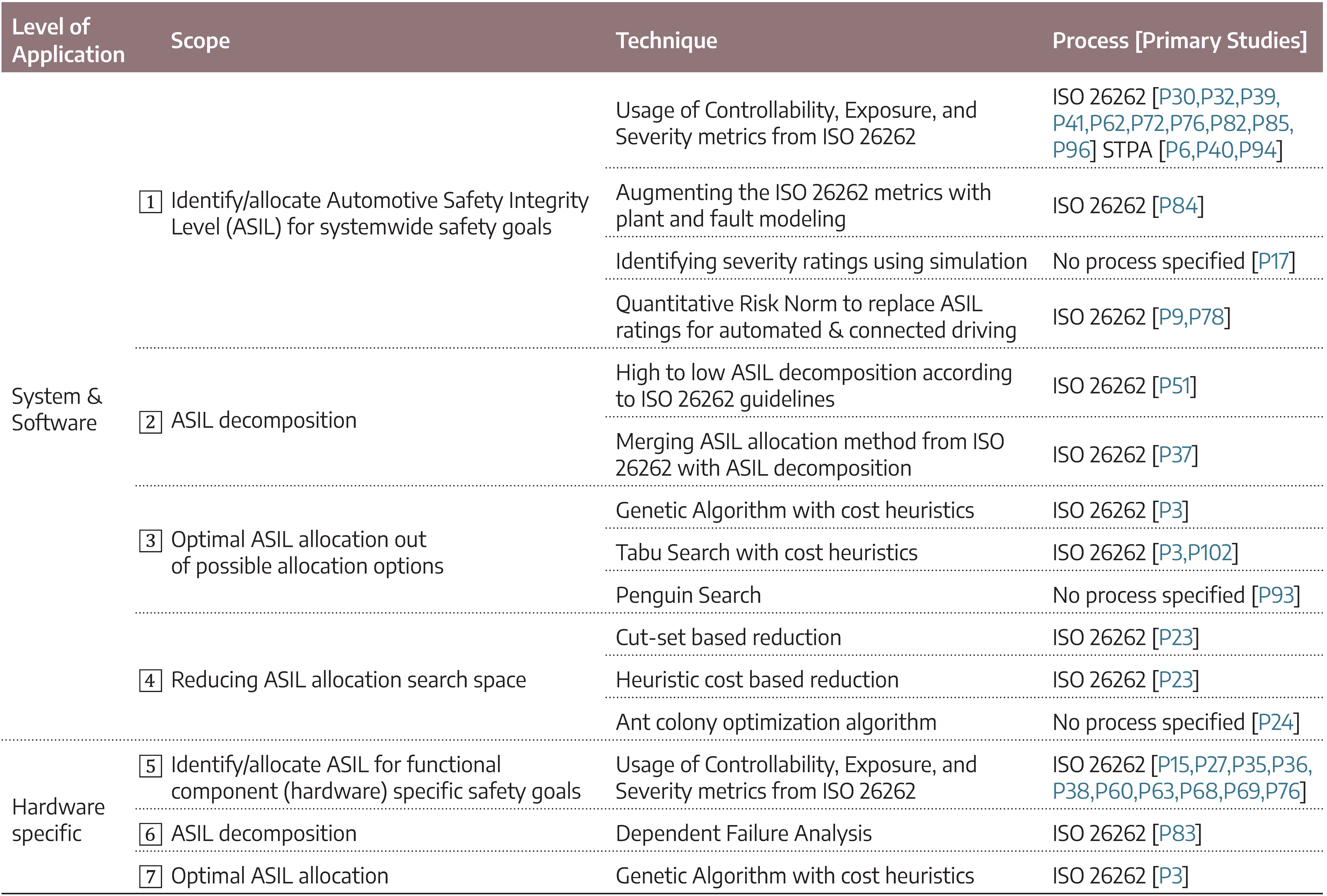 Gheraibia et al. [55] reviewed different approaches for the specific sub-phase of product development, ASIL allocation. ASIL allocation methods find optimal allocations of ASILs (QM, A, B, C, D, with QM being negligible risk and D being highest risk) to system architecture components such that safety requirements are guaranteed to be met at the lowest possible cost. They classify approaches for ASIL allocation into two categories – exact and optimization approaches – and present the pros and cons of each method.